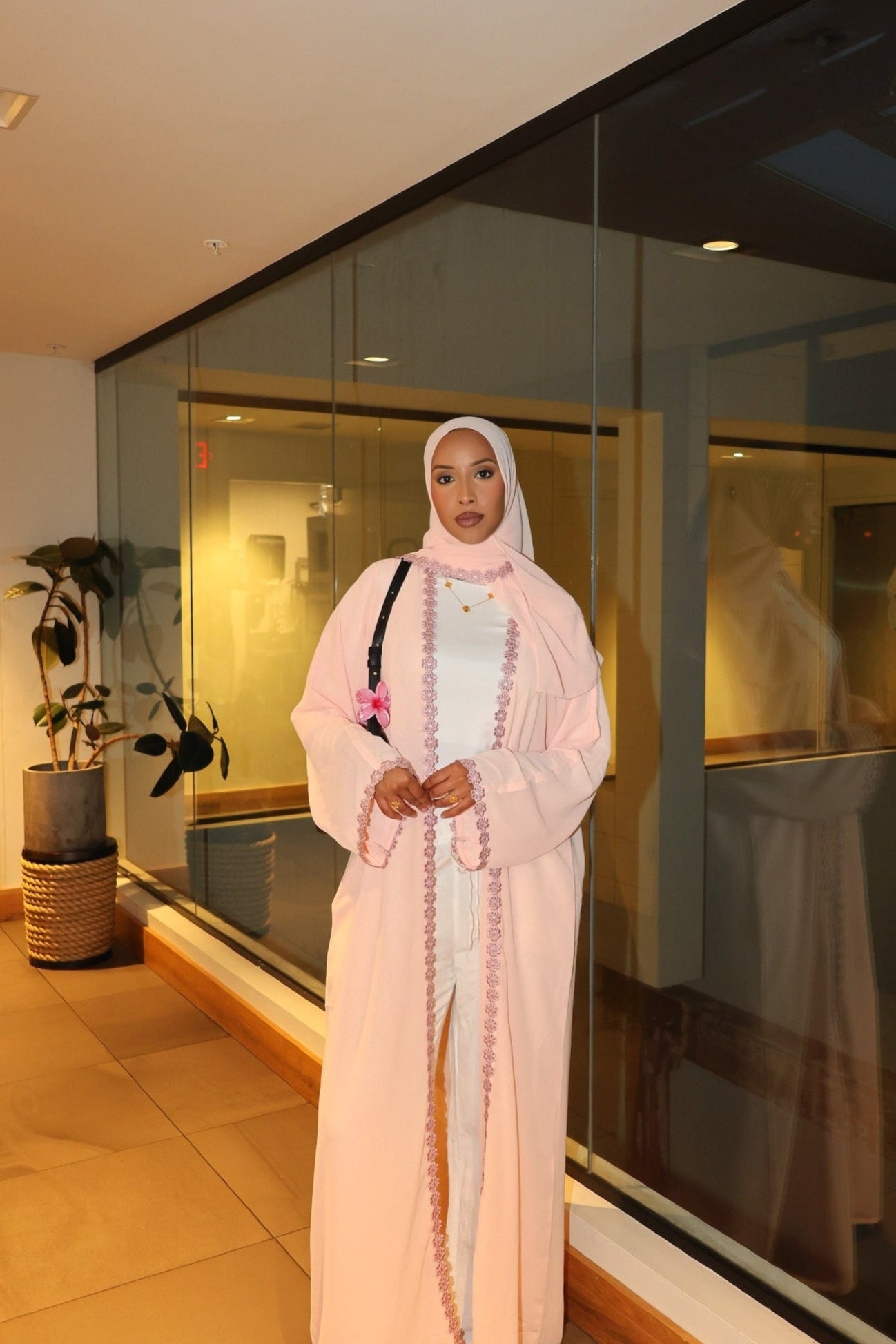 Our Pale Pink Abaya made from soft, lightweight chiffon. Perfect for days when you want to feel comfortable but still look great. The delicate floral lace details on the hem add a pretty, feminine touch without being over the top.