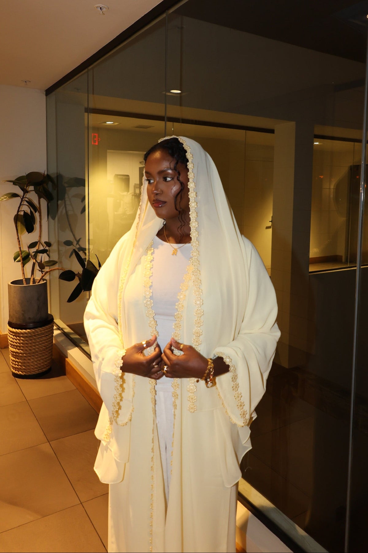 Our Butter Yellow Abaya made from soft, lightweight chiffon. Perfect for days when you want to feel comfortable but still look great. The delicate floral lace details on the hem add a pretty, feminine touch without being over the top.